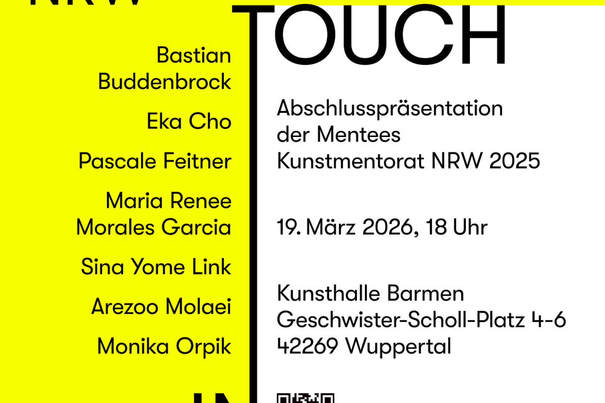 Jetzt schon vormerken: am 19.3., um 18 Uhr gastiert die Abschlusspräsentation der Mentees in der Kunsthalle Barmen in Wuppertal. Inmitten der laufenden Ausstellung zeigen Bastian Buddenbrock, Eka Cho, Pascale Feitner, Marie Renee Morales Garcia, Sina Yome Link, Arezoo Molaei und Monika Orpik für einen Abend ihre grafischen Editionen, die sie als Abschlussprojekt ihres Jahres beim Kunstmentorat NRW 2025/26 entwickelt haben. Begleitet wird der Abend von einem Lecture- und Performanceprogramm.