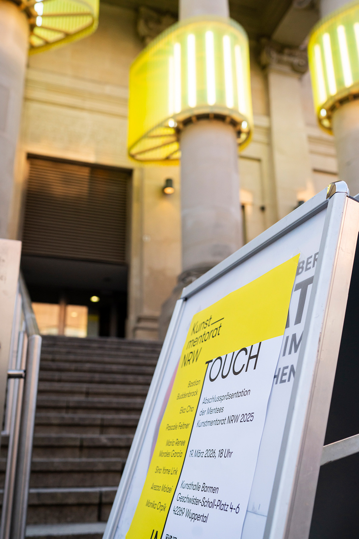 Das Format der Abschlusspräsentation IN TOUCH wurde im Jahr 2023 als Teil des Förderprogramms Kunstmentorat NRW inauguriert. Dabei bekommen die Mentees der jeweiligen Staffel die Möglichkeit, ein Abschlussprojekt ihrer Wahl selbstständig in der Gruppe zu erarbeiten. Das kann etwa eine Publikation oder eine Veranstaltung sein. Essentieller Baustein der gemeinsamen Planung und Organisation dieses Abschlussprojekts ist neben der Übernahme von Verantwortung für die Sache ein respektvoller und wertschätzender Umgang, obgleich sich die Mentees vor Beginn ihres Jahres im Kunstmentorat NRW kaum kannten.